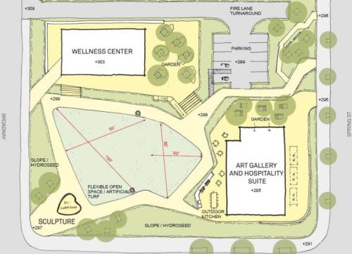 The project would activate an empty lot with green space and a gallery