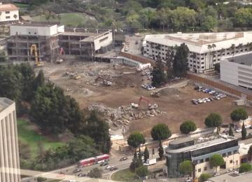 $200 million hotel tower rising at intersection Wilshire and Santa Monica Boulevards.