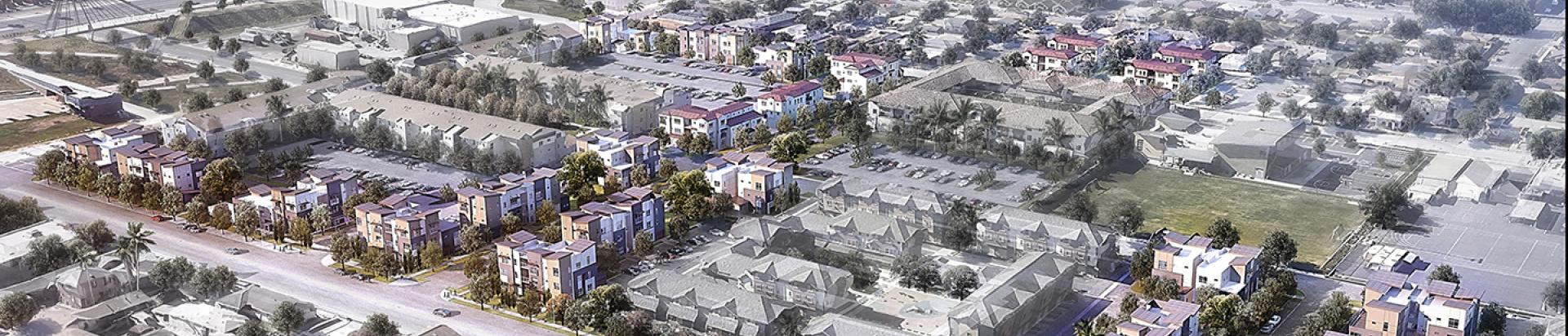 Plans show a new town center on Anaheim Street with a grocer and a Costco-like store