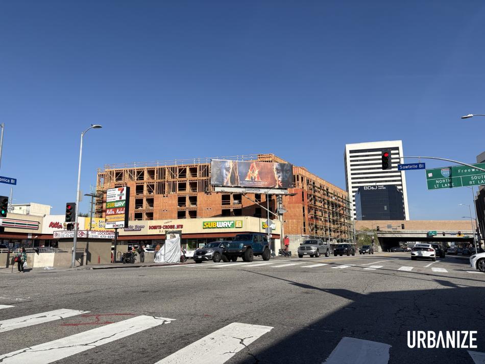 Wood framing is starting to sprout next to the 405 Freeway's Santa Monica Boulevard exit in Sawtelle, as construction takes shape for a new multifamily residential complex from Wiseman Residential.