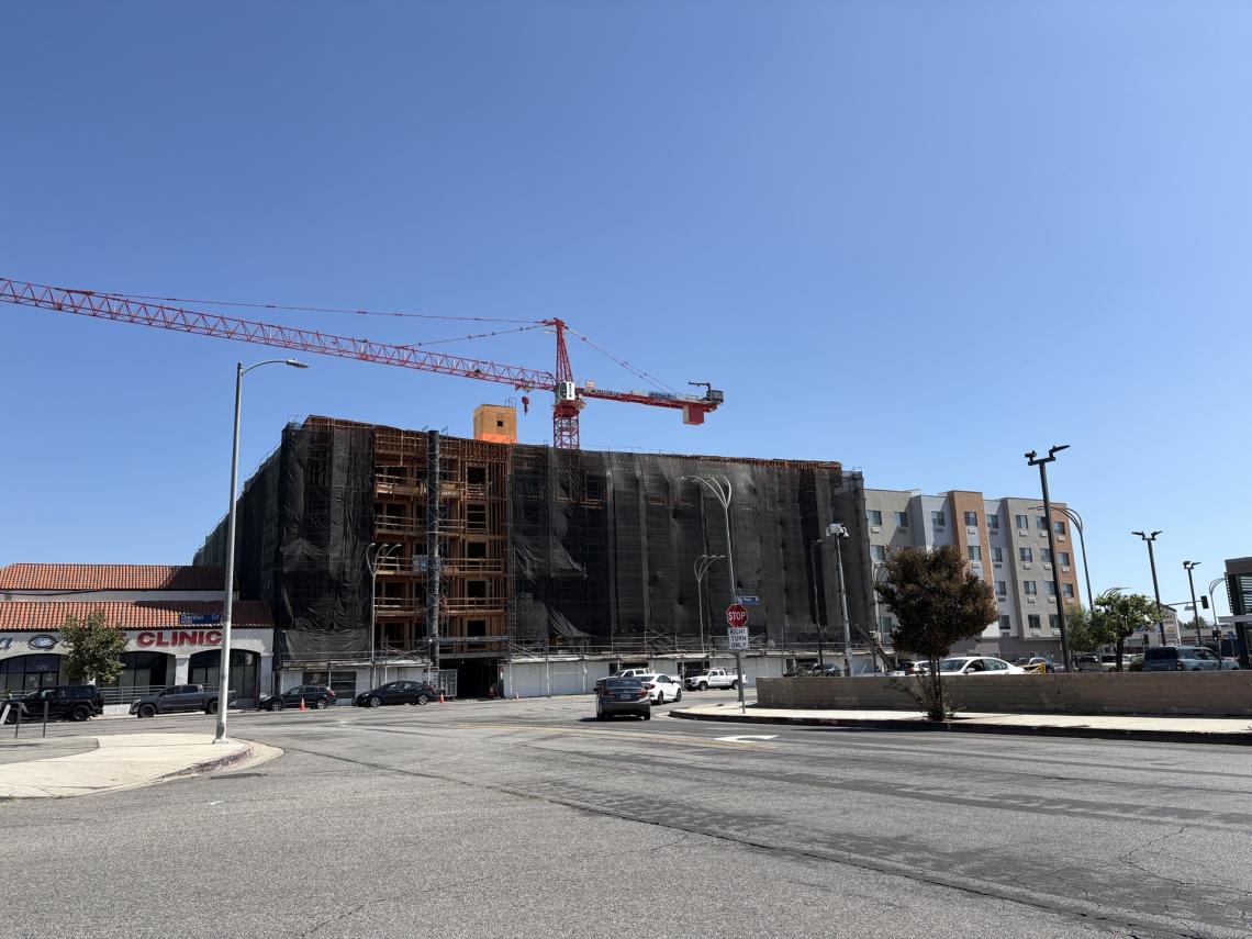 At the intersection of Van Nuys Boulevard and Vose Street, wood framing has reached its peak for a new mixed-use apartment complex from Alliant Strategic.