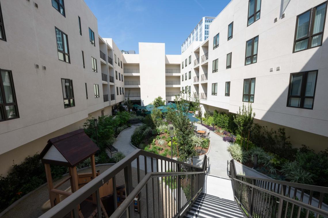 HED designed the contemporary low-rise building, which includes a central courtyard, a recreation room, and a community room.