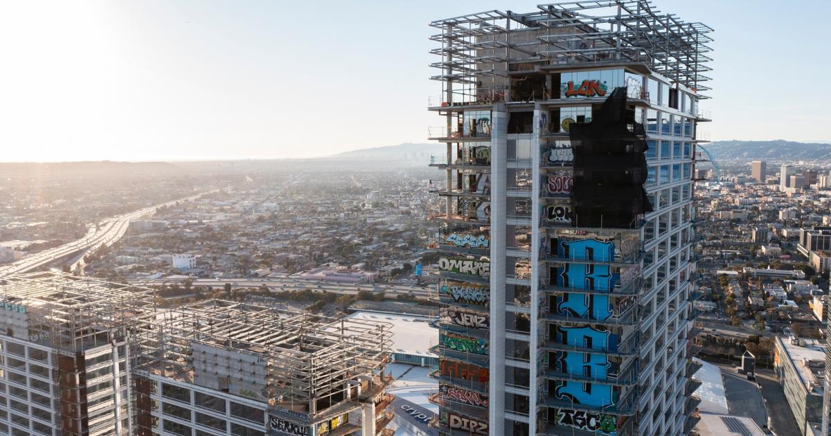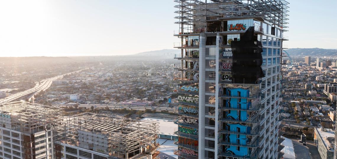 The three-tower complex, which spans a full city block across the street from Crypto.com Arena, includes three towers rising above a shared retail podium. As initially planned by Oceanwide Holdings, the Chinese-based real estate firm which acquired the site in 2014, the towers were to contain 504 condominiums, a 184-room hotel, and a 150,000-square-foot retail podium. However, work on the project stalled in 2019 following months of rumored cost overruns, and in the wake of new restrictions on outbound investment imposed by the Chinese government. Years later, as the site sat unattended, the towers became a magnet for graffiti artists who tagged the trio of buildings from top to bottom.