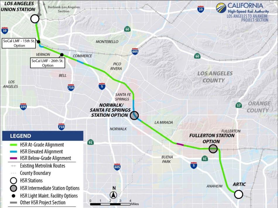Last week, the California High Speed Rail Authority released its draft environmental study for the Los Angeles to Anaheim segment of the project - the final leg of its initial phase. The authority is studying two build alternatives for the approximately 30-mile corridor, both of which would involve sharing track with existing passenger rail systems between Union Station in Downtown Los Angeles and ARTIC in Anaheim. The preferred alternative involves the construction of a maintenance and storage facility at 26th Street in Vernon, although a second location is also under construction at 15th Street in Downtown.
