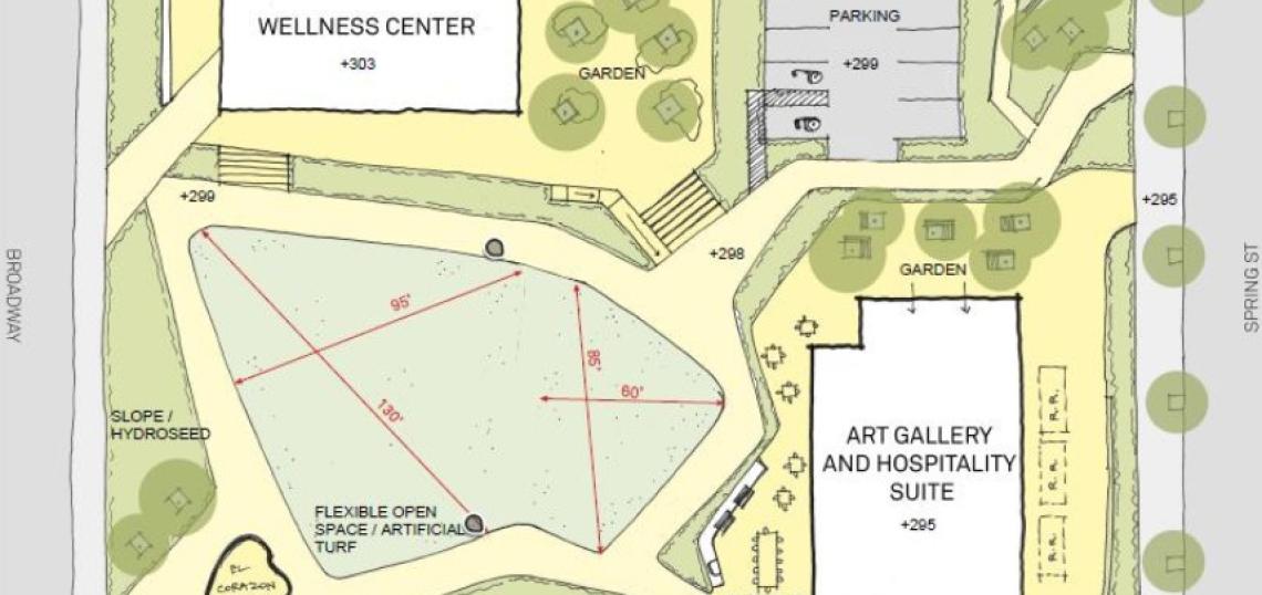 The DLANC presentation further elaborates on that plan, called El Corazon Art Park, which would include greenscaping for outdoor sports, public sculptures and art installations, and an art gallery. A site plan for the space, designed by Studio-MLA, shows a flexible green space and wellness center located toward the Broadway site of the site, and a two-story gallery fronting Spring Street to the south. A small parking lot is also proposed for the space.