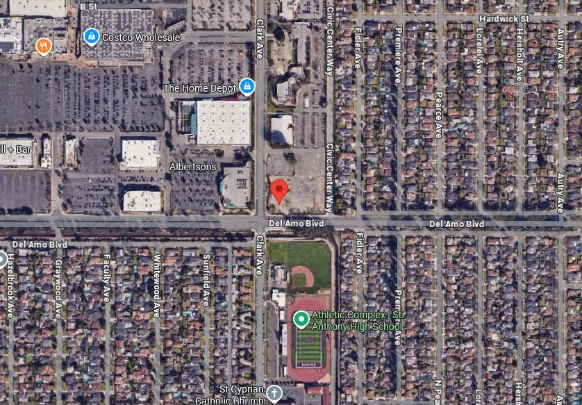 The plaza, which will be located at 4900 Clark Avenue, is imagined as a 4.3-acre space including a playground, a performance area, landscaping, surface parking, and restrooms. City officials expect the new plaza would be used for community events such as farmers markets, as well as for other events currently hosted elsewhere including a 4th of July Block Part, concerts, and a Christmas tree lighting. Parking for an unspecified number of vehicles would be provided in a surface lot at the northern side of the space.