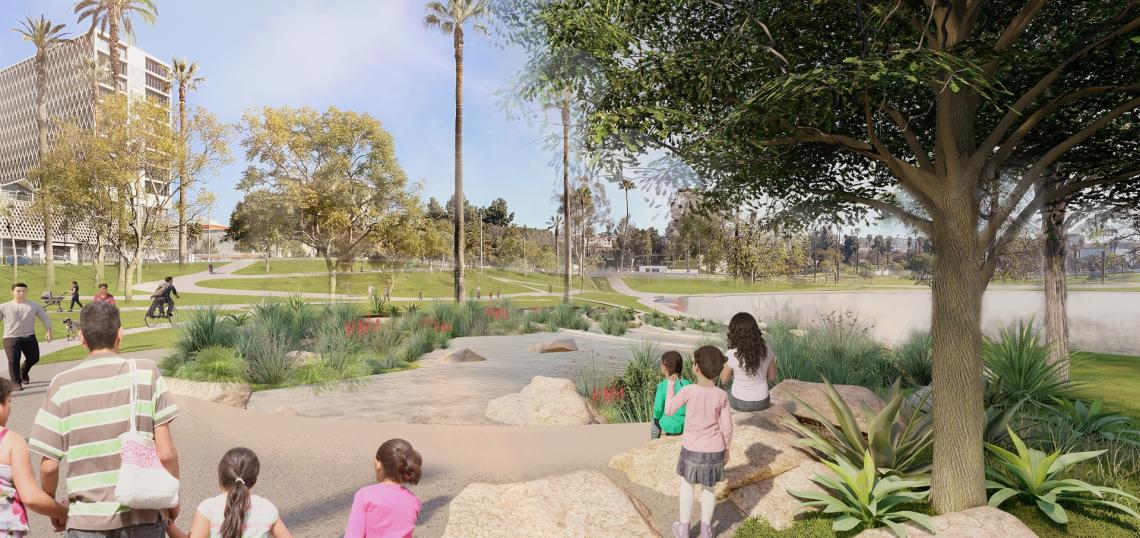 The $40-million project, funded by Measure W, will allow MacArthur Park's lake to rely on diverted, treated stormwater runoff after completion. While much of the cost associated with the project will go toward underground infrastructure, its above-ground presence will be in the form of a new cascading water feature, lined with shaded seating areas, landscaping, and walking paths, as well as a pedestrian bridge.