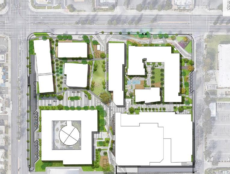 DLR Group is designing The Walk which is shown in renderings with commercial uses located in an open-air setting toward Imperial Highway and Norwalk Boulevard, with housing in seven-story buildings toward the eastern part of the site. The project is expected to employ modular construction.