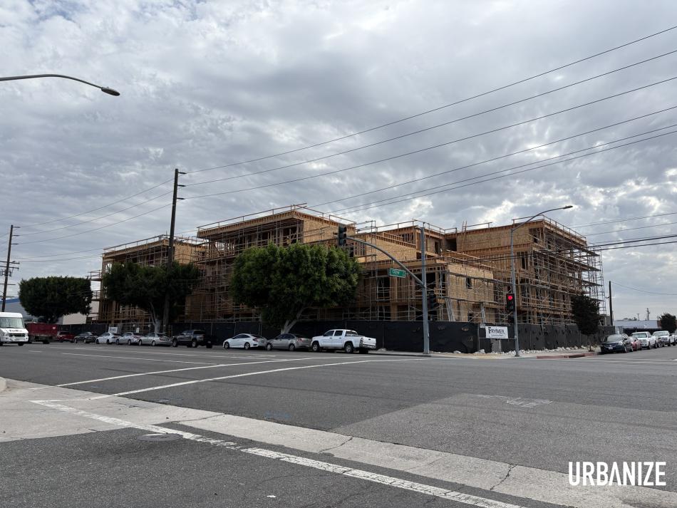Months after starting work in Gardena, wood framing has reached its peak for a new single-room occupancy apartment complex from Cocoon.
