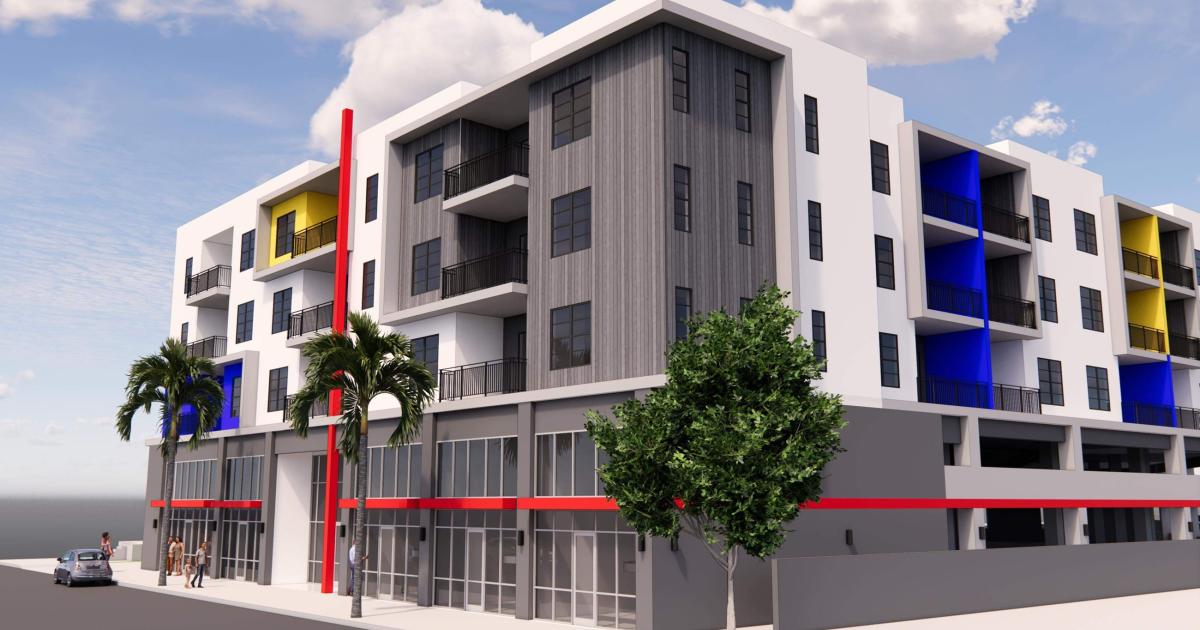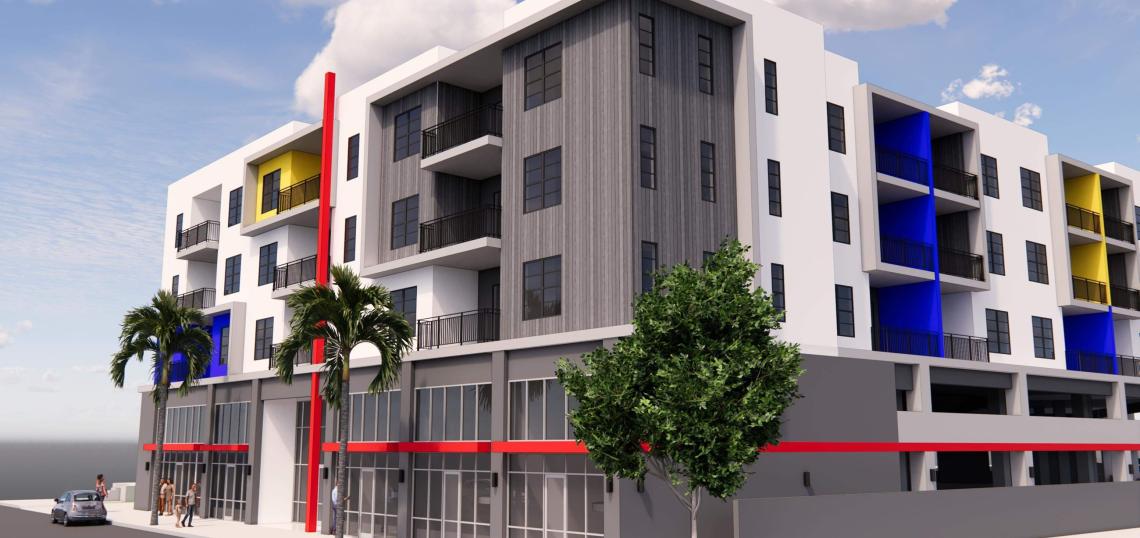 Tag Design Works is designing the project, which is depicted in a rendering as a contemporary podium-type building. Plans show an amenity deck at the building's third floor.