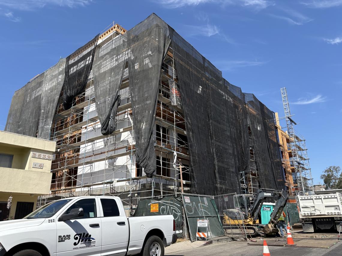 Just south of the E Line's Palms Station, framing is complete for a new multifamily residential building from Geneva Street Partners.