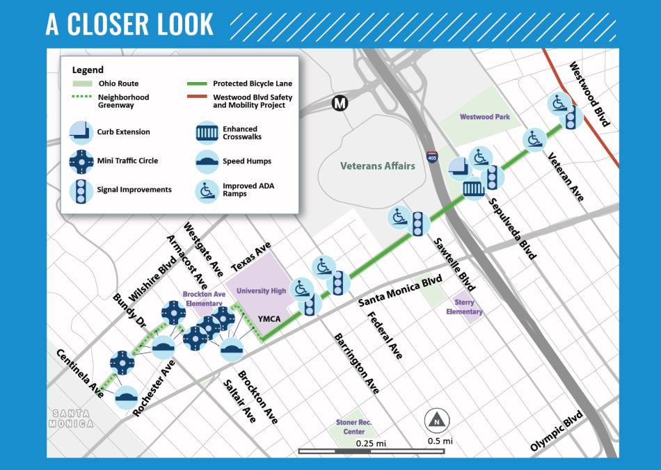 The Ohio Avenue Safety and Mobility project, which would span from Westwood Boulevard in the east to Centinela Avenue at the Santa Monica city line on the west, would include protected bike lanes as well as a host of other traffic calming measures. Continuous two-way protected bike lanes would be built along the segment of Ohio running from Westwood underneath the I-405 Freeway, before terminating at Ohio's endpoint at Westgate Avenue next to University High School. From there, the corridor would continue meandering westward as a "neighborhood greenway" on side streets toward its eventual terminus.