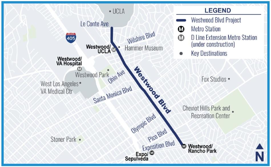 LADOT is also in the outreach phase for a similar project along Westwood Boulevard, although specific improvements have yet to be announced. The project corridor spans from the UCLA campus in the north to Exposition Boulevard in the south, and would connect with Metro stops on the D and E Lines, as well as the Ohio Avenue corridor.