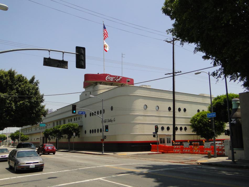 Built in 1936 at 1334 S. Central Avenue, the Coca-Cola Building was designed by architect Robert Derrah in the Streamline Moderne style. According to the Los Angeles Conservancy, Derrah designed the building to resemble an ocean liner. That theme is emphasized by subtle touches like the porthole windows which line the exterior, and more obvious elements such as the life preservers displayed on the interior emblazoned with "S.S. Coca-Cola."
