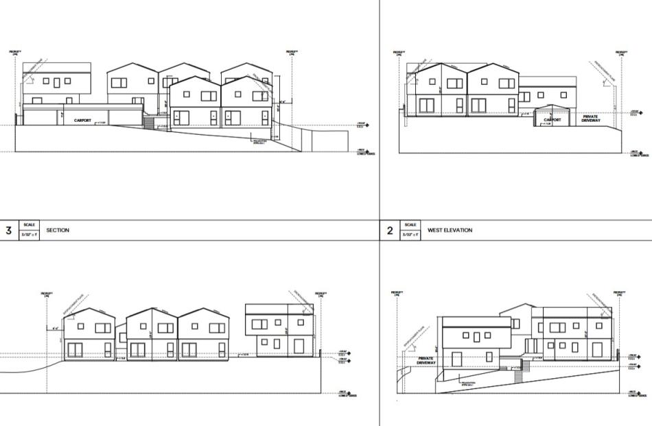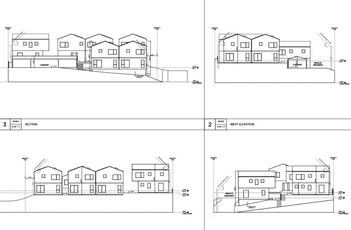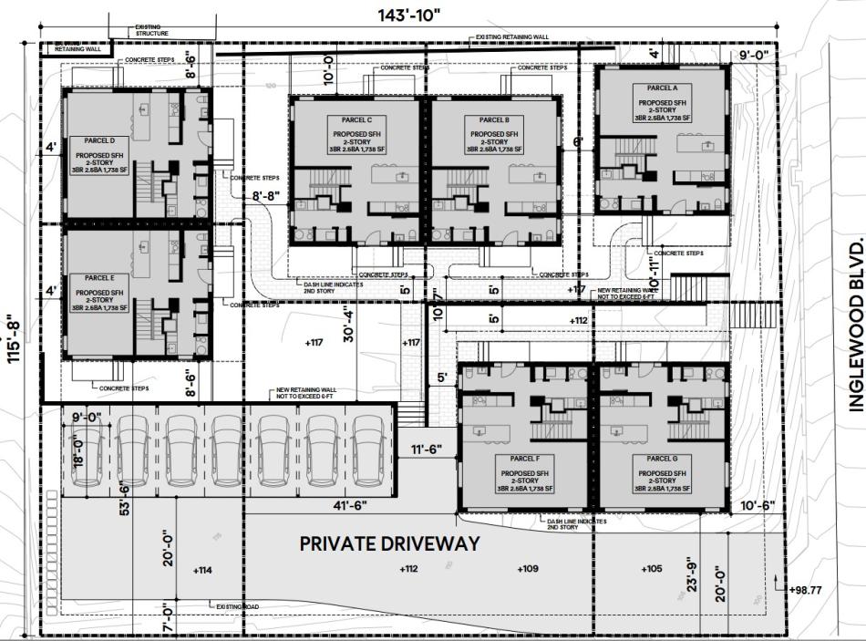 The roughly 0.39-acre property at 3671 Inglewood Boulevard, previously developed with a single-family home, is to be subdivided into seven parcels, each of which would be developed with its own home. Plans show a mix of contemporary two-story dwellings, each with three bedrooms and 1,738 square feet of living area. Rather than providing dedicated parking on the ground floor, the project includes a private driveway and a shared carport for seven vehicles.