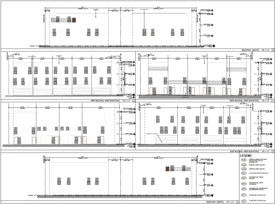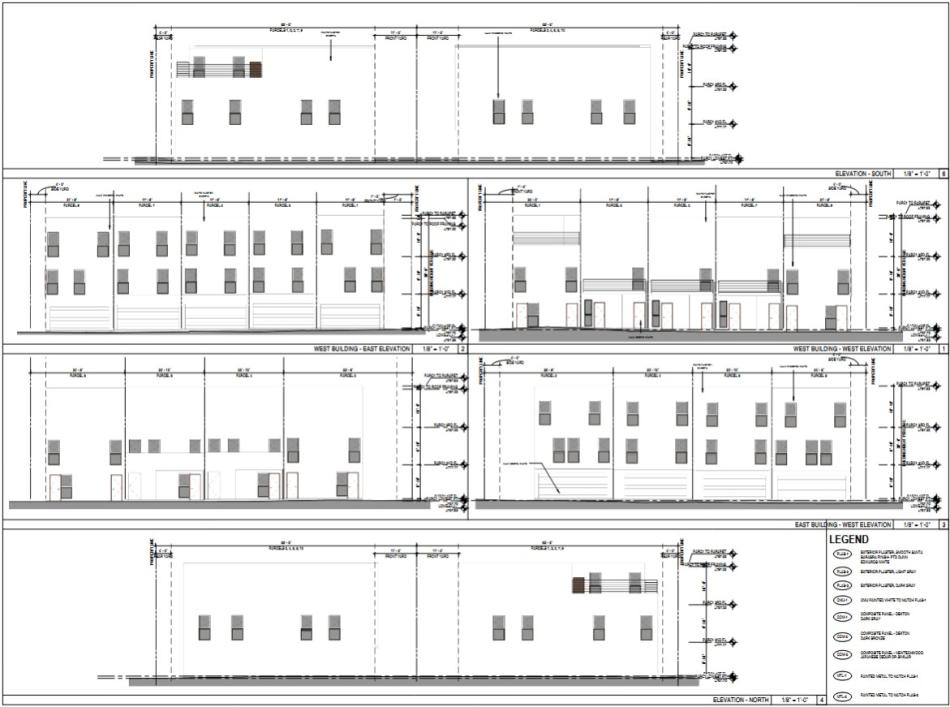 JZA Architecture is designing the project, which is shown in as contemporary three-story homes, each featuring three bedrooms and a two-car garage. The homes are arranged in two rows around a common driveway.