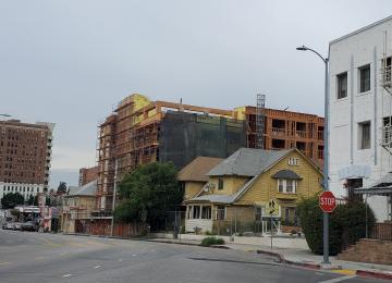 Six-story, 43-unit development fully-framed at 1537 W 8th Street in Westlake