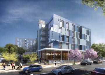 The new hotel is located a block from the Green Line's Mariposa Station.