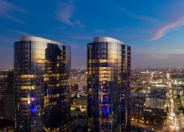 The twin 35-story buildings feature 648 apartments across the street from Staples Center.