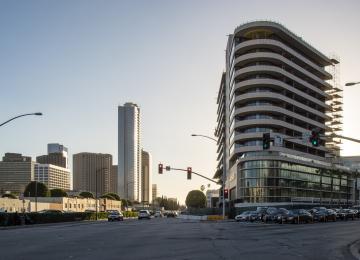 $200 million hotel tower rising at intersection Wilshire and Santa Monica Boulevards.